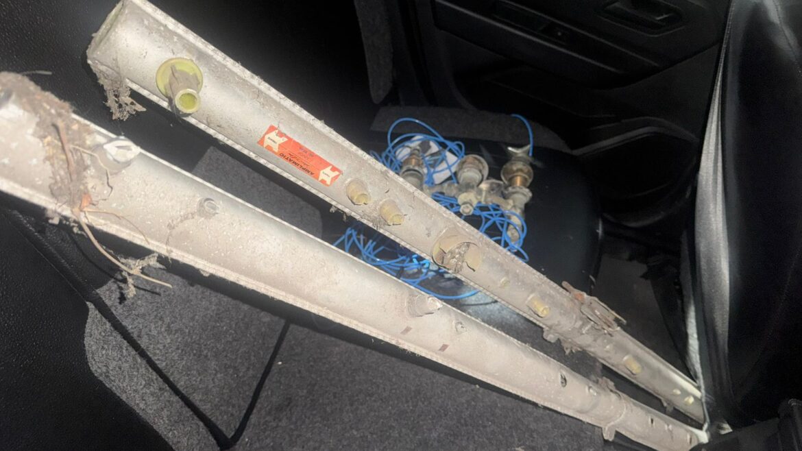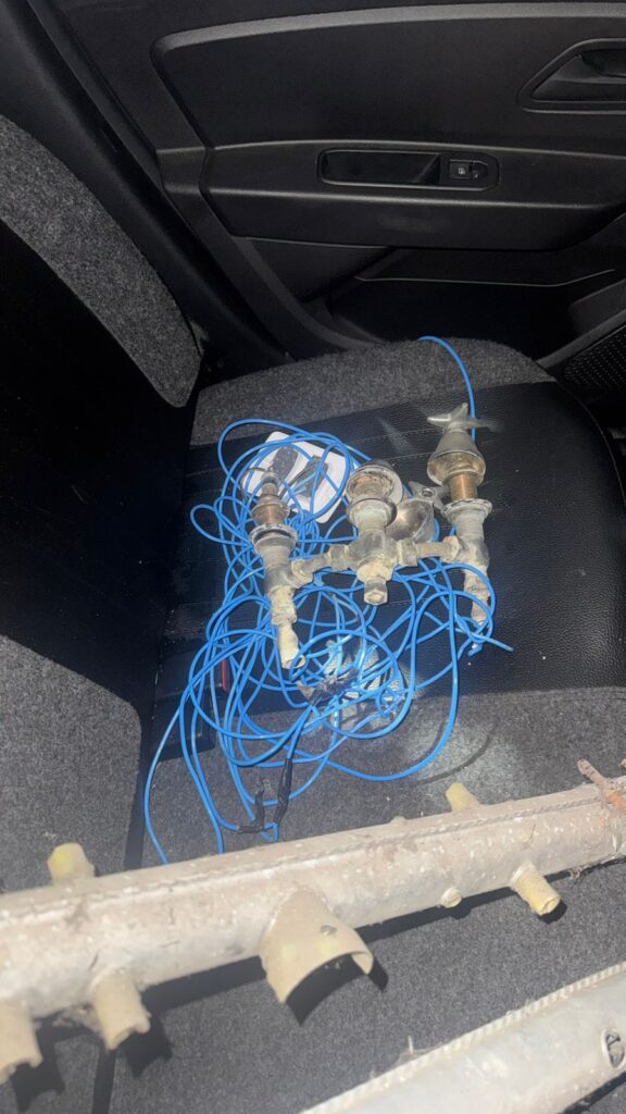 Durante a varredura no perímetro, os policiais visualizaram o homem sobre o telhado de uma residência vizinha. No momento da abordagem, o suspeito abandonou os objetos furtados, entre eles um rolo de fio, uma antena de TV e um registro de água.