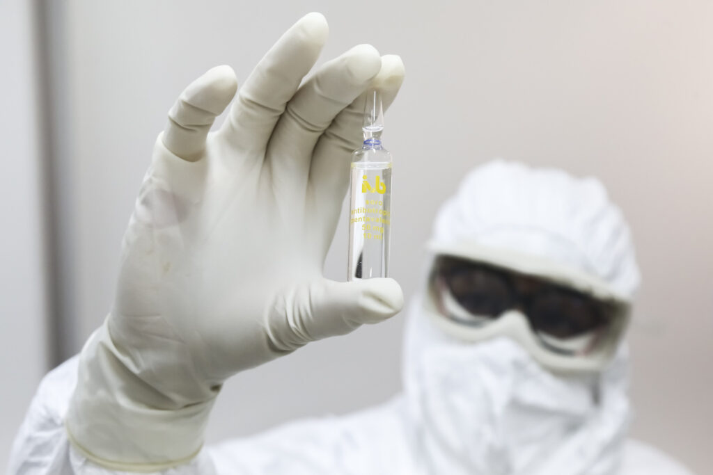 Em seguida, o soro passa por um processo de precipitação, no qual os anticorpos são purificados e separados dos demais componentes do plasma. Depois disso, o soro passa por diafiltração, clarificação e isotorização, processos que refinam e estabilizam o produto. É nesta fase que o concentrado de anticorpos vai para os testes de controle de qualidade. Se aprovado, segue para a formulação, envase, teste de integridade, revisão e, por fim, o acondicionamento para a distribuição.