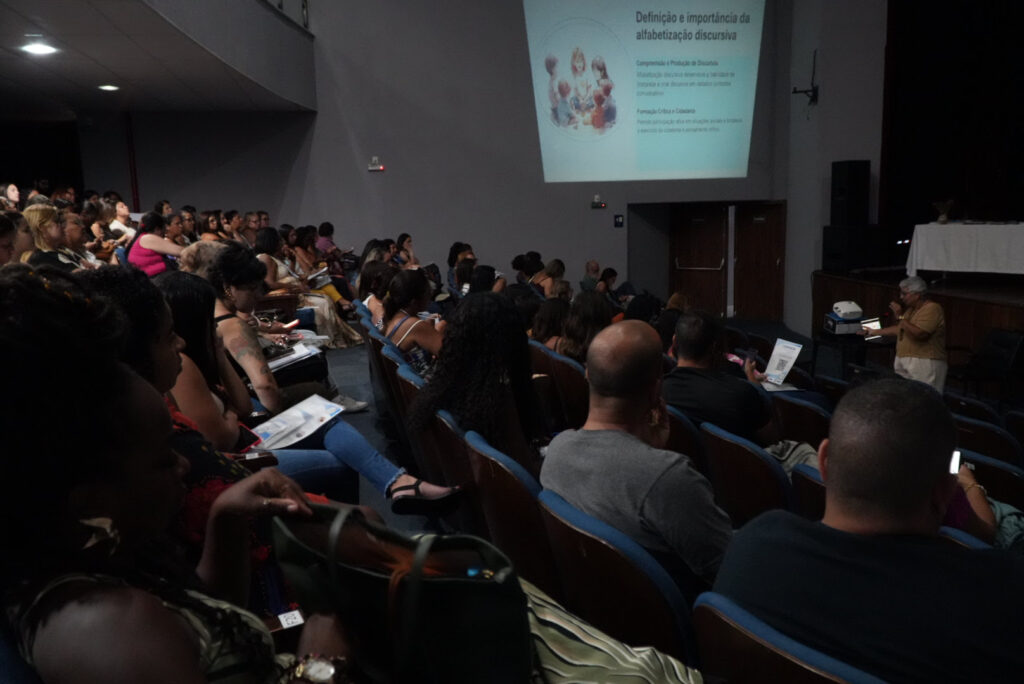 No Teatro Municipal, a professora do 2º ano da Escola Municipal João Belchior Marques Goulart, no bairro Tribobó, Suziane de Oliveira, prestou atenção em cada detalhe da palestra da doutora e Neurociência e Cognição, Rita Sant’Anna.
