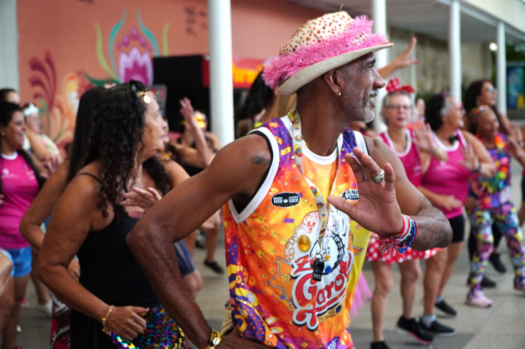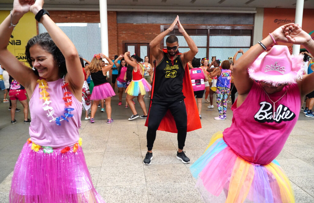 11/02 – A entrada do Partage Shopping foi tomada por foliões fantasiados e muitos sorrisos durante o aulão ‘Zumba Folia’, com foco no Carnaval, do projeto “Qualidade de Vida e Longevidade”, da Secretaria de Esporte e Lazer da Prefeitura de São Gonçalo, nesta manhã de quarta-feira (11). Mais de 100 pessoas de diversos núcleos da cidade estavam fantasiadas, dançando músicas sob o comando de 12 professores do projeto.